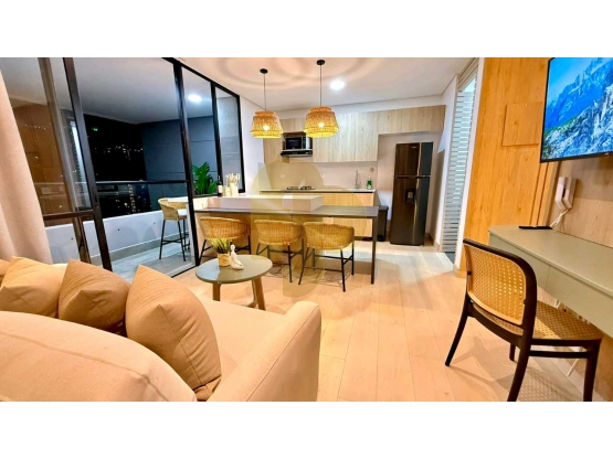 Apartaestudio AIRBNB en el Poblado cerca al Tesoro. Piso alto, *50 m²*, 1 alcoba con baño y vestier, baño social, zona de estudio, balcón amplio con vista panorámica. Parqueadero. Gimnasio, coworking, zona de yoga. Restaurante. *Renta desde 1 noche*.